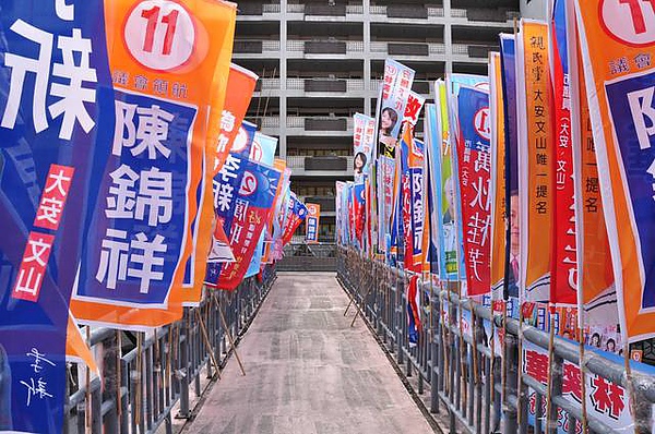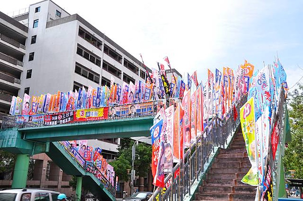 國家考場旁邊的天橋上,已被競選旗幟佔據,大家都深怕沒插到,選民看不見他.....